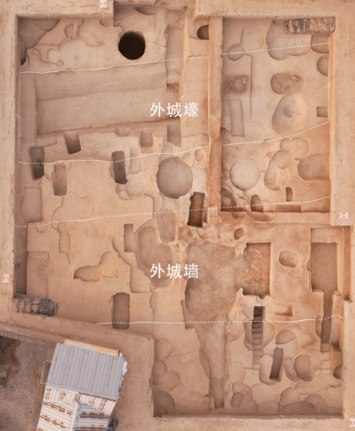 明确遗址两重城垣结构。在内城外发现外城壕和外城墙。外城壕可见北段、东段,探明长度1020米。壕内堆积丰富,发现8座祭祀牛坑及填埋的羊、猪、狗等。外城墙位于城壕南侧3~5米外,仅余基槽底部,由花土夯筑。使用年代约为西周早期,西周中期前废弃。