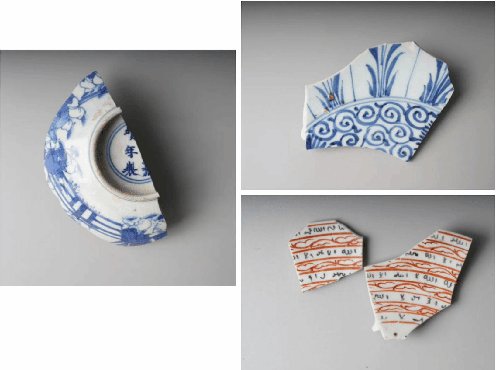 ▲ 从左到右、从上到下分别为:天后宫出土“大明嘉靖年制”款瓷片底足部、清真寺出土清早期青花盘、清真寺出土清早中期幻方瓷盘