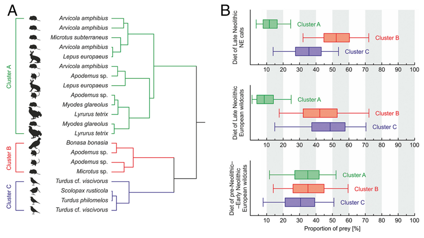 经过对不同阶段数种不同动物的碳氮稳定同位素分析后可以发现,不论非洲野猫/家猫还是欧洲野猫的食谱在铜石并用时期较新石器早期更不均衡,它们捕食了更多与人类聚落共生的动物,而非野生动物。若将罗马时期包含在内,则可以发现在早期新石器时代,猫的氮值显著低于人类和聚落内的狗,但在罗马时期,猫的氮值则显著高于人和狗,说明猫在此时已经主要依赖人类聚落提供食物。因此,稳定同位素的证据进一步肯定了家猫在新石器晚期阶段才与人类共生,并在罗马时期形成驯化,而在新石器时代较早阶段非洲野猫成分的出现应与人类关系较弱。