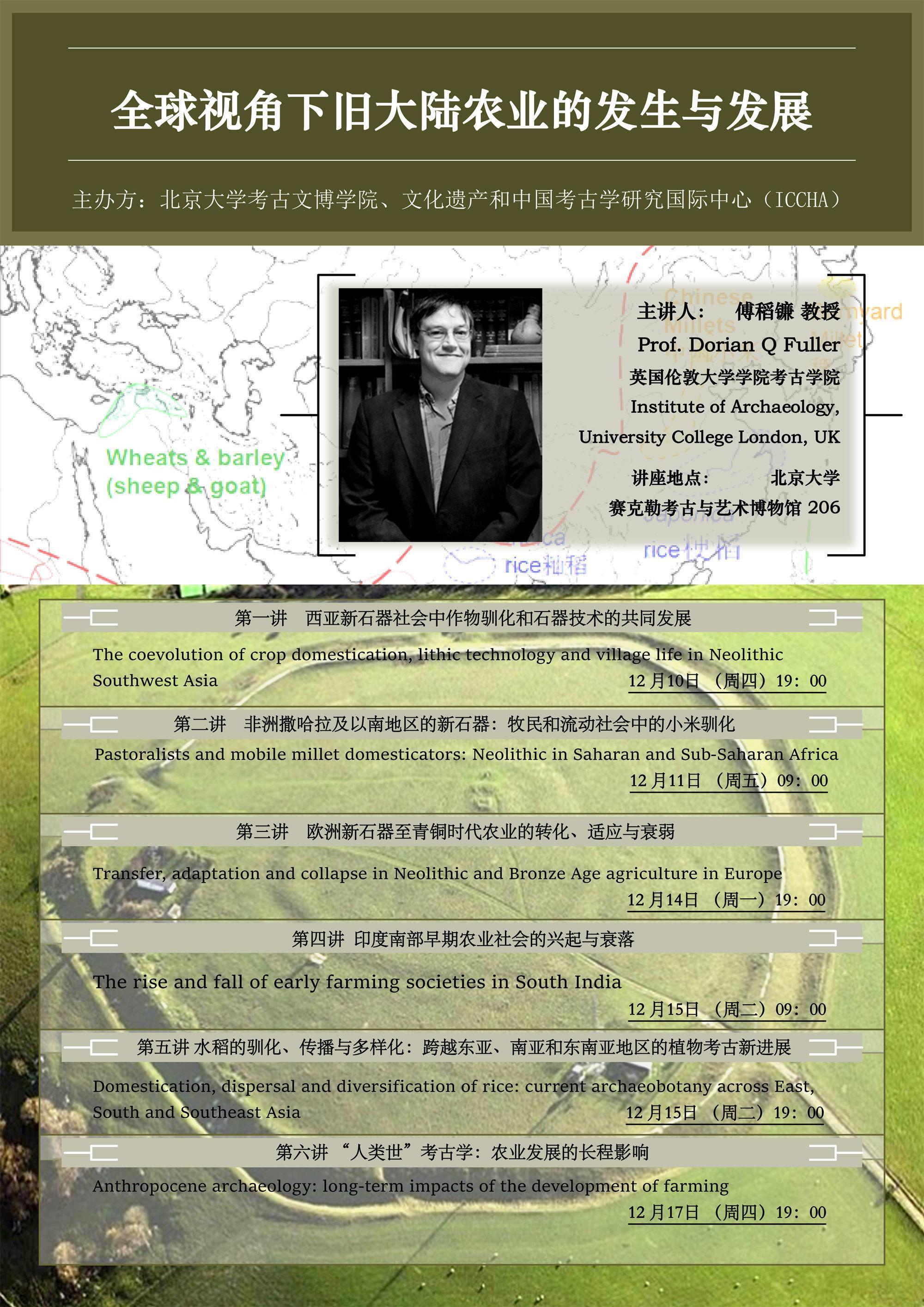 主讲人Dorian Q Fuller傅稻镰是伦敦大学学院(University College London)考古学院教授,文化遗产保护与中国考古学研究国际中心(ICCHA)主任。他的主要研究领域为植物考古学、农业考古和新石器时代考古,田野工作包括印度、中国、东南亚及非洲北部等多个地区与国家。已发表学术论文两百四十余篇。傅稻镰教授正在主持开展ERC(欧洲研究委员会)项目“农业之路的比较研究”;并获得英国NERC(自然环境研究委员会)资助开展另一项关于稻作在中国和东南亚传播的课题。