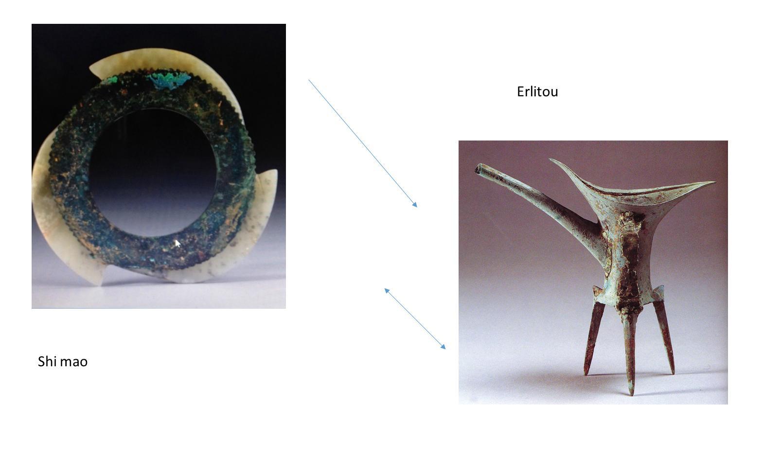 罗森教授提供的讲座图片之一,探讨了石峁出土的玉与青铜结合的器物与二里头出土的铜爵之间的关系