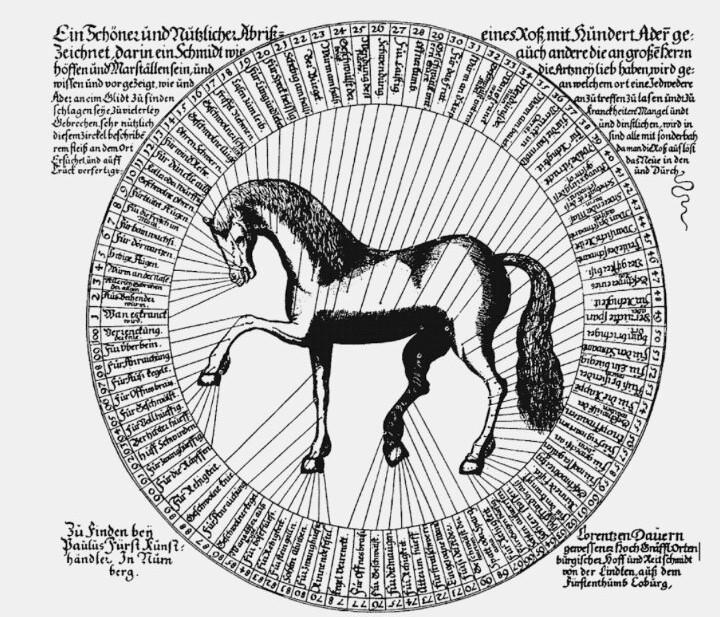 医马术:一百种病的放血点,德国纽伦堡铜版画,1639年