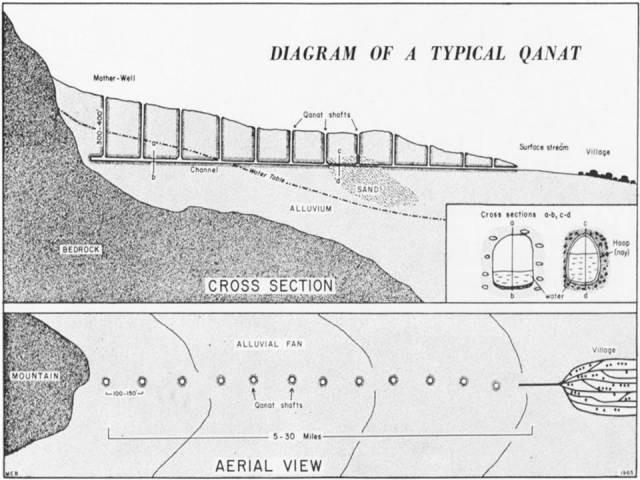 伊朗大部分区域十分干旱,除了北部和西部的少量地区降水相对充足外,大部分区域的农业生产只有依赖于灌溉系统才得以进行。目前伊朗境内已知最早的灌渠年代大致为公元前5500年。除了常见的由地表水渠构成的灌溉系统外,暗渠(Qanat)是伊朗地区广泛使用的一种特殊的灌溉系统,其历史可以追溯到阿契美尼德王朝时期。这一系统可以有效应对地表径流稀少和日照导致的高蒸发率等问题。暗渠技术不仅是一种工程奇迹,也是一种引人注目的社会现象,其营建需要集中大量的劳动力,并且需要社会群体之间的相互协作。这一系统对农业生产的发展具有重要意义,同时也对当地的聚落形态和社会经济发展产生了深远影响。