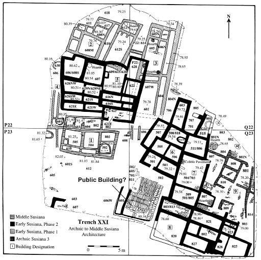 作为埃兰平原的另一处中心性遗址,Chogha Mish在苏萨中期晚段(约公元前五千纪后期)开始崭露头角,整个遗址面积达到15公顷。其中最为明显的一个变化是,大约从公元前5000年开始,Chogha Mish遗址中建造了一个大型纪念性建筑(monumental building),台基顶面长宽各达20米以上。此外,Chogha Mish遗址还发现了大量的建筑遗存,大多为平行分布的长排房屋,厚厚的泥砖墙体保存高度达1.5米左右。很多建筑因为毁于失火,其内保存了大量炭化的有机材料,屋顶的木料和芦苇等都清晰可见。房屋内的原有陈设也都得以全部保留,出土了大量的陶器等生活用品,一些房址中还可见到原址保存的打制石器的证据。此外,遗址中出土的封泥,同样告诉我们当时存在着较为成熟的仓储和管理系统。