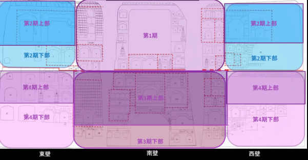根据第11窟营建过程的复原,八木教授将窟内工程分为四期,各期之间存在一定程度的时代重叠。其中第二、三、四期上下部的细致划分以各壁面现存佛龛的下缘为界。