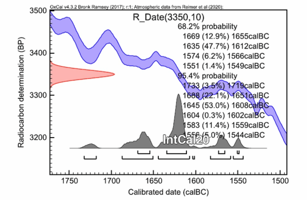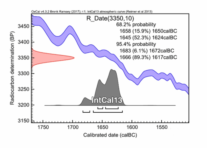 同时,利用加速器质谱法测量样品量小的特点,可以有更多的单一年轮的数据纳入校正曲线,数据量的增加也使得IntCal20相较于之前的校正曲线更加精细。吴小红教授举出圣托里尼的例子来说明越精细的校正曲线对校正后日历年代数据的影响是有一定影响的。公元前两千纪,圣托里尼的火山喷发是地中海地区青铜时代中的一个重要事件,该事件发生的时间历来存在争议。碳十四测年的数据显示火山喷发发生在距今3350±10年,但由于这一区间恰好处于此前的校正曲线的平台期,因此所对应的日历年代很难更加精细,IntCal13校正的结果始终比考古认定的年代早一世纪。而将同样的碳十四测年数据用IntCal20进行校正,可以看出曲线越精细,越容易划分出多段的概率区间。使用IntCal20曲线的校正结果显示,约有17%的概率进入公元前16世纪(95.4%置信度),从而与考古研究得出的年代结果更为接近。尽管碳十四测年结果并不能给出一个确切的数字,但是其提供的年代区间为其他方向的研究提供有效参考。