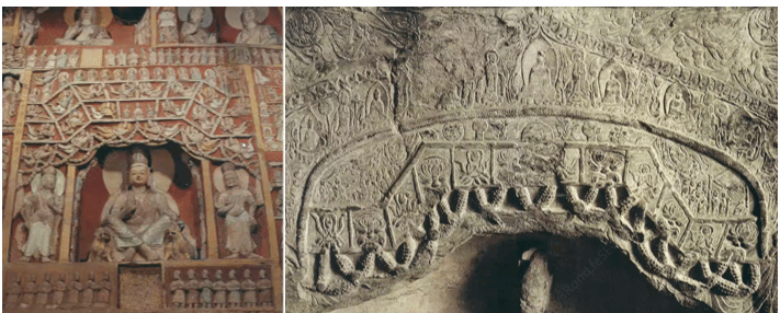 泛化和形式化殊途同归,在云冈石窟中已经存在,如圆拱龛楣外添加了富于装饰意味的双层盝顶;龙门石窟中也有所表现,如圆拱尖楣龛与盝顶形、下坠花绳的结合,盝顶上添加的鸱吻、宝珠装饰等,均是盝顶形式化的体现。