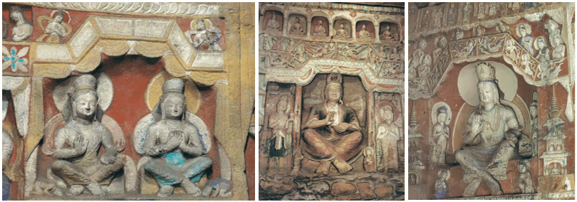 云冈盝顶形龛的融合与创新主要有三点表现。第一,题材内容的多样化,出现立佛、坐佛、交脚双弥勒以及多层供养菩萨。第二,两侧菩萨由坐姿改为站立,从听法菩萨变成胁侍菩萨,这是云冈盝顶形龛的重要创新,其影响极为深远。第三,出现五开间的盝顶新形制,晚期逐渐加入维摩文殊、中国楼阁式塔等新题材。