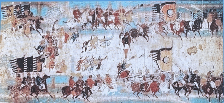 战争也是不可忽视的影响因素。唐代会雇佣外来民族加入军队,大量骑兵由北方部族组成。唐代帝陵允许外族陪葬,如昭陵陪葬的尉迟敬德、阿史那忠分别为鲜卑人和突厥人。敦煌莫高窟的《张议潮统军出行图》(图3)与章怀太子墓内《客使图》(图4)反映出战争与外交两种中央政府的对外形态。