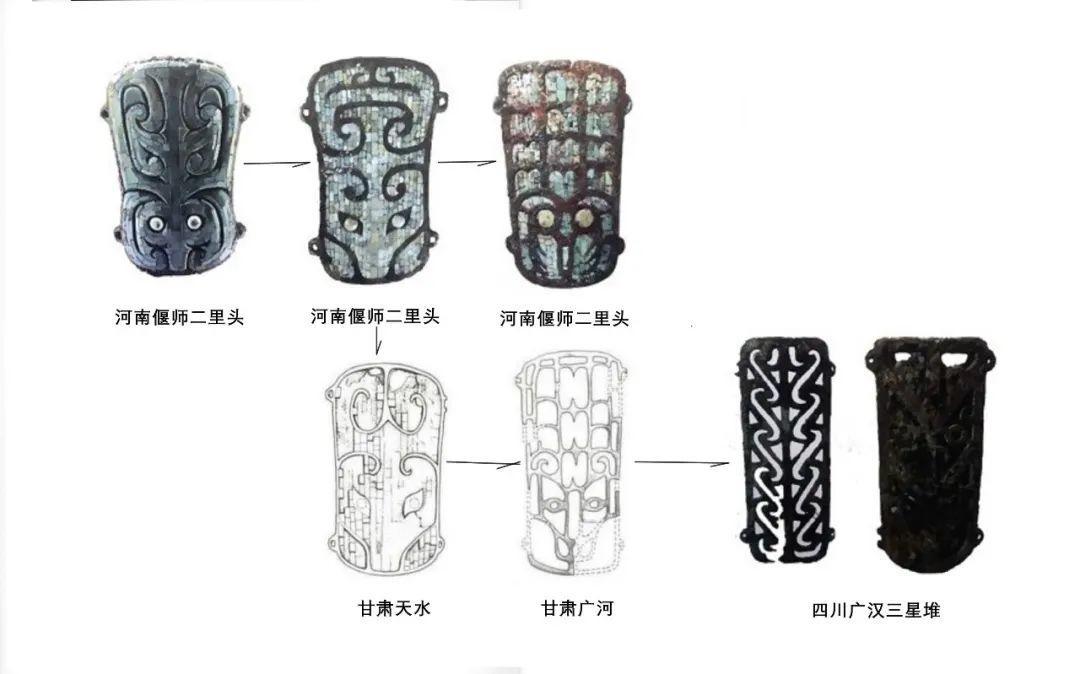 汉中盆地青铜器集中出土于城固和洋县一带,时代可大致分为殷墟早期、殷墟中期和殷墟晚期三个时期,以殷墟中期数量最多。铜器的空间分布随时代同步变迁,最早器群位于西北侧的城固龙头,最晚器群位于东南侧的洋县张村,其余位于二者之间,时代亦然。器物具有多元文化面貌,青铜容器为中原体系,器型以尊、瓿、罍占绝大多数;人面饰、兽面饰则具有关中地区文化因素,尖顶铜泡等或为地方特色;璋形器、眼形器等则常见于三星堆和金沙遗址,二者或具有相同的礼仪制度与观念,孙华老师据此推测此时三星堆的势力已扩展至汉中盆地。