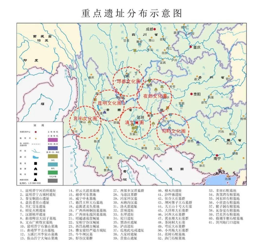 夜郎文化圈。川滇黔之间以昭鲁盆地为中心的地区,近年通过对贵州威宁县中水地区系列相关遗址和墓地的发掘,结合云南鲁甸野石山等遗址的材料,基本掌握了该地区自青铜时代的鸡公山文化起,通过野石山类型的过渡遗存,再到战国晚期至西汉前期银子坛/可乐类型遗存,最后到秦汉两晋时期的文化发展进程。基于文献记录的牂柯、且兰、夜郎、滇的位置关系,推测滇东黔西地区可能即夜郎所在,夜郎的中心可能就在云南曲靖盆地而非贵州。