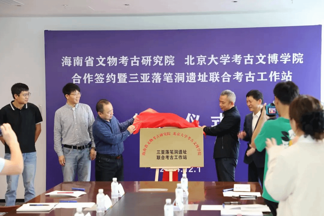 在热烈的掌声中,苏启雅、沈睿文、宋建忠、邓振华、钟凤毛、李锋等共同为海南省文物考古研究院与北京大学考古文博学院三亚落笔洞遗址联合考古工作站揭牌。双方将以联合考古工作站建设为契机,长远谋划、高标准发展,扎实做好田野考古工作,推动史前洞穴考古学术研究,服务落笔洞考古遗址公园建设,讲好海南考古故事。